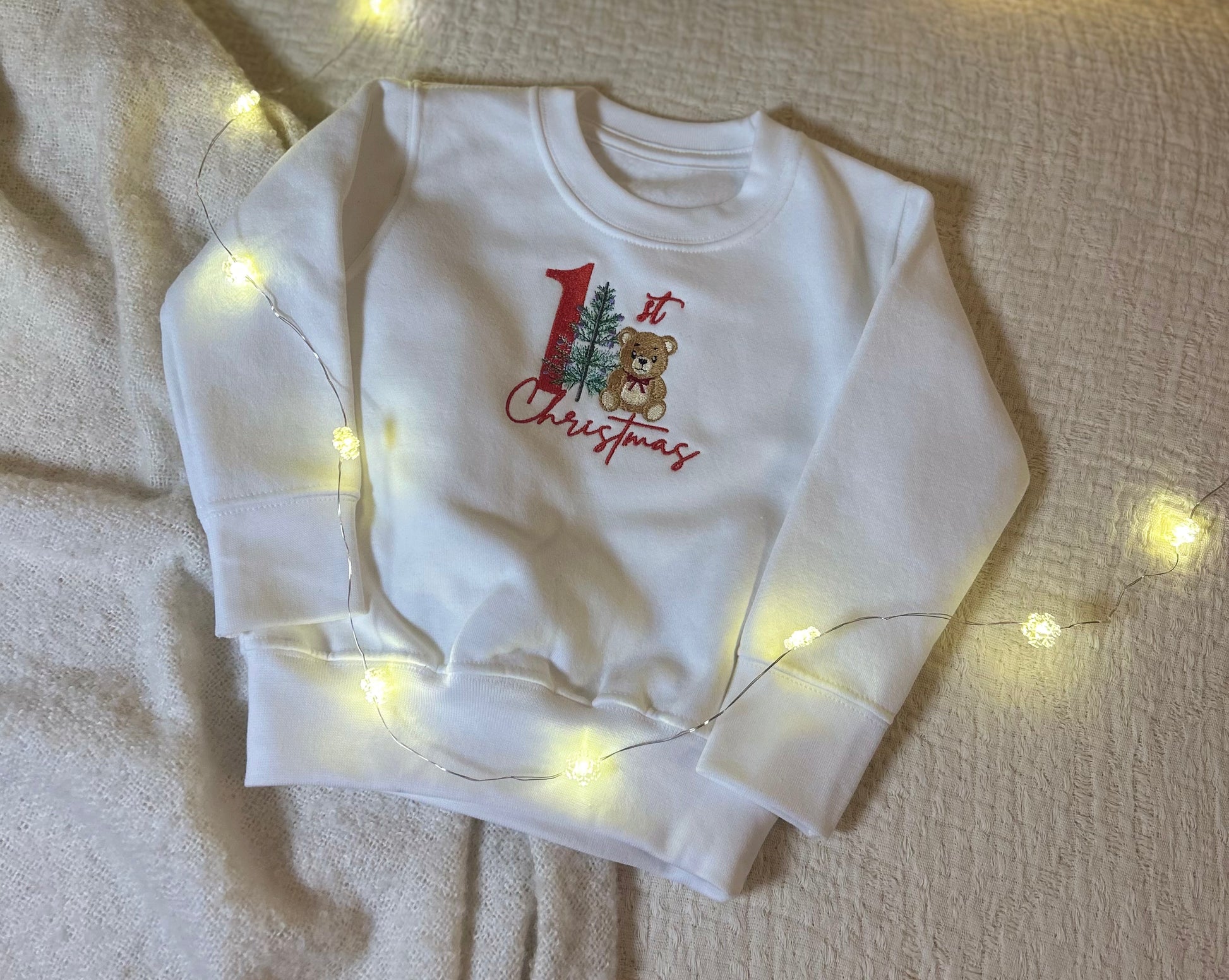 Our teddy and pine tree embroidery sits softly on white cotton-rich fleece, creating the kind of keepsake you’ll tuck away long after the decorations come down.