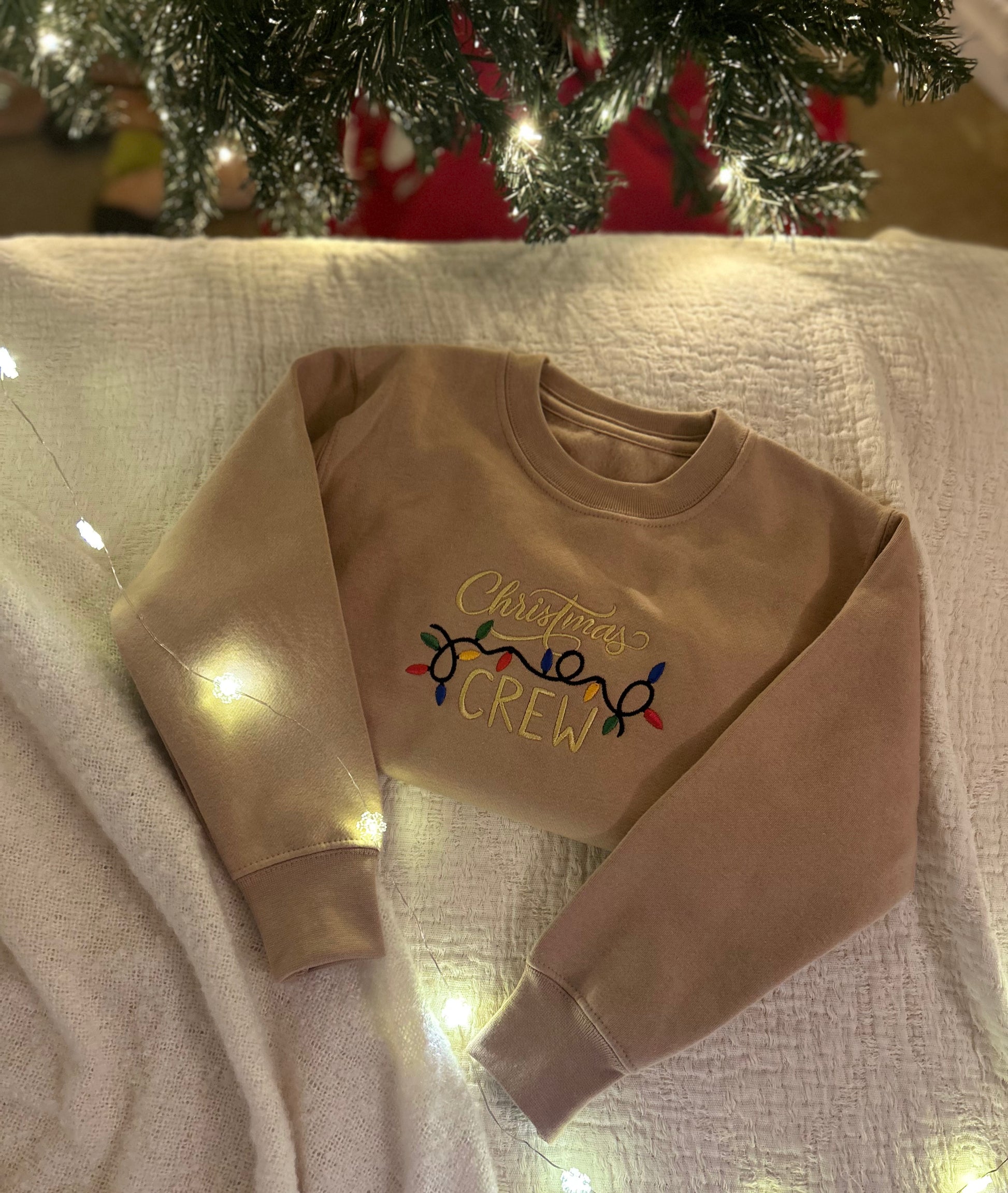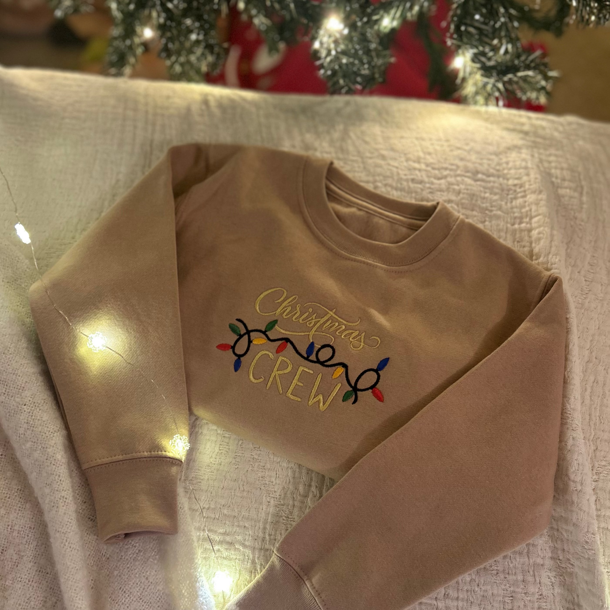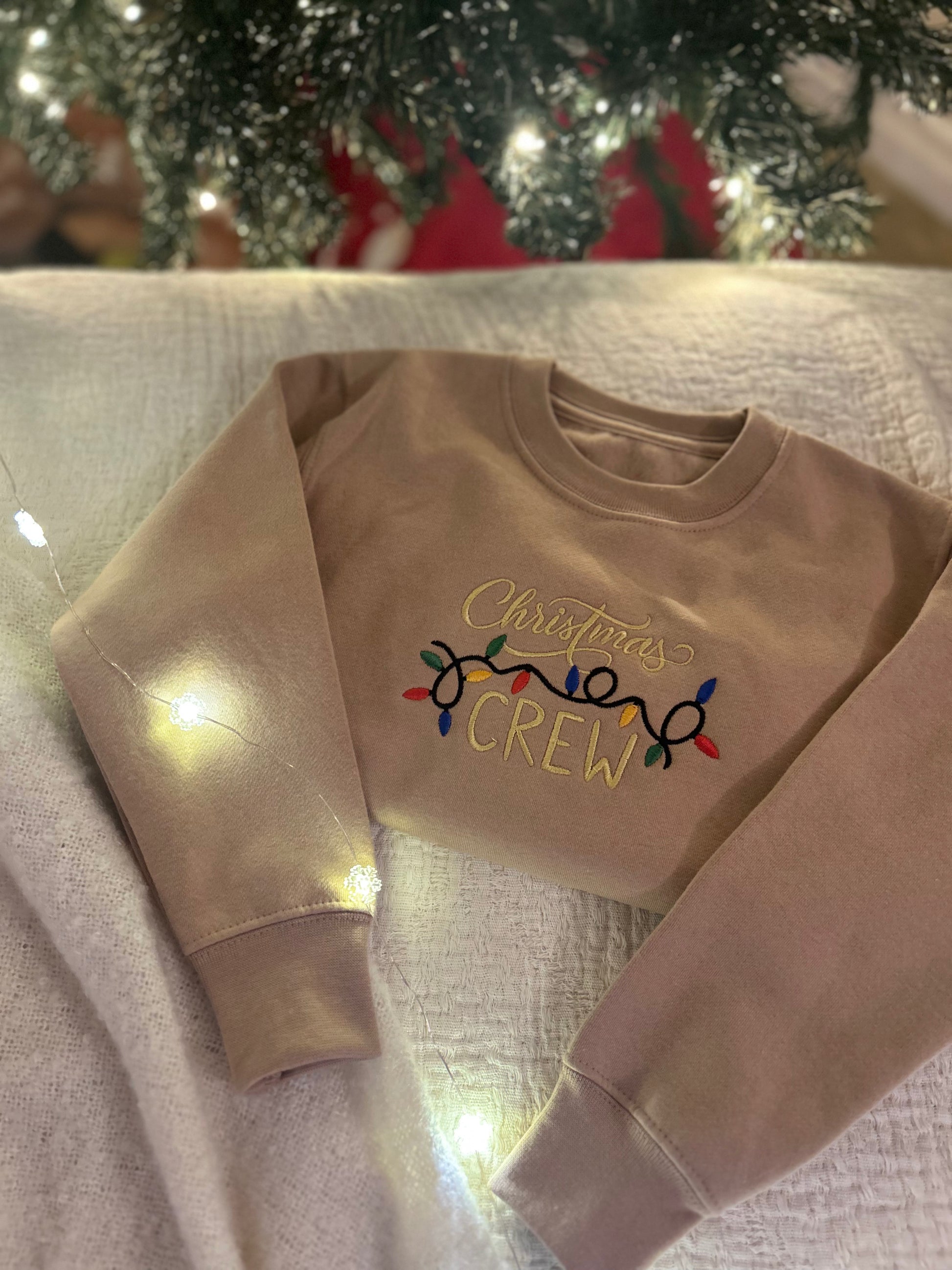 Christmas Crew glows in golden thread beneath a string of embroidered lights - made for matching moments and festive family photos.