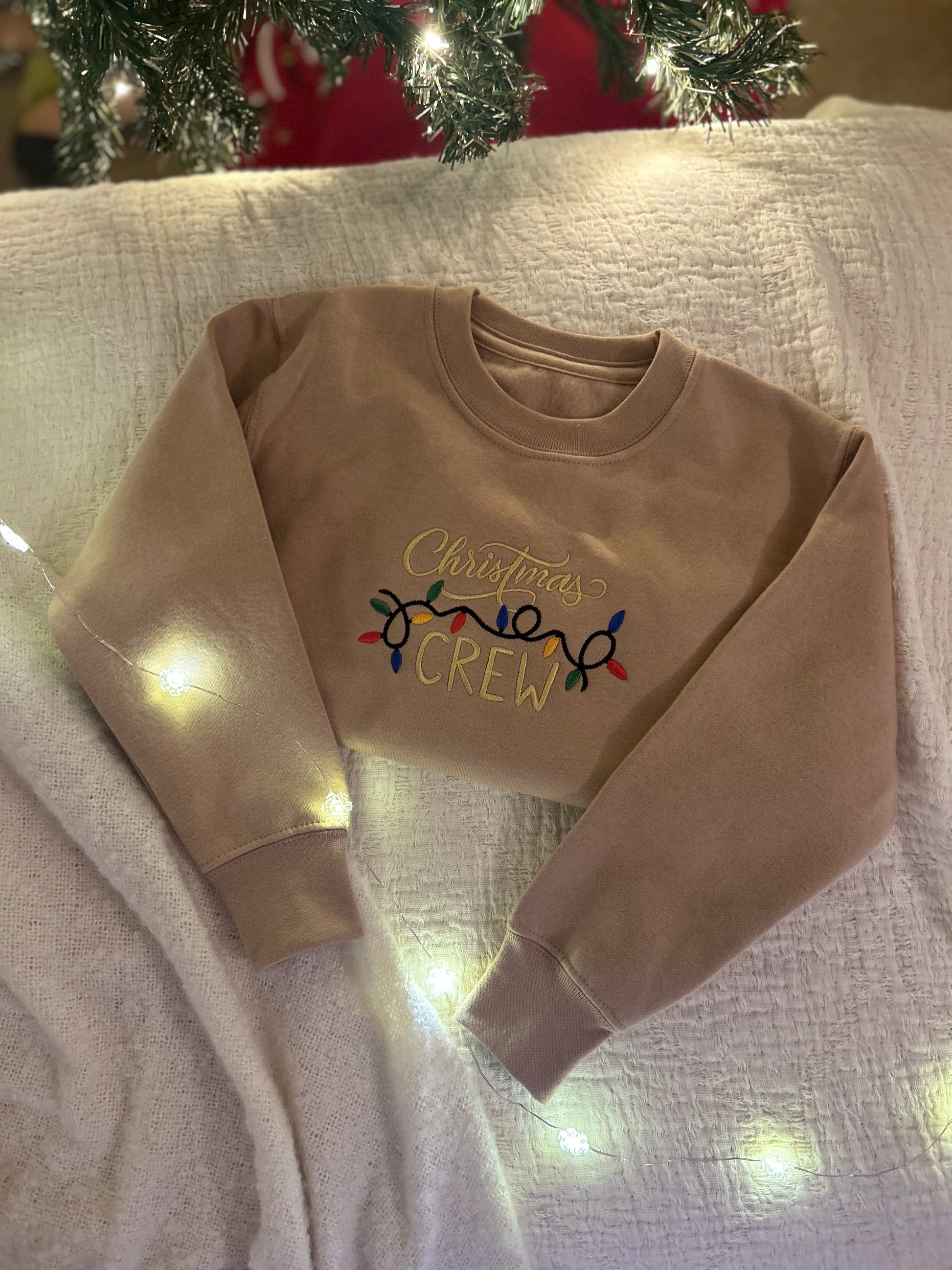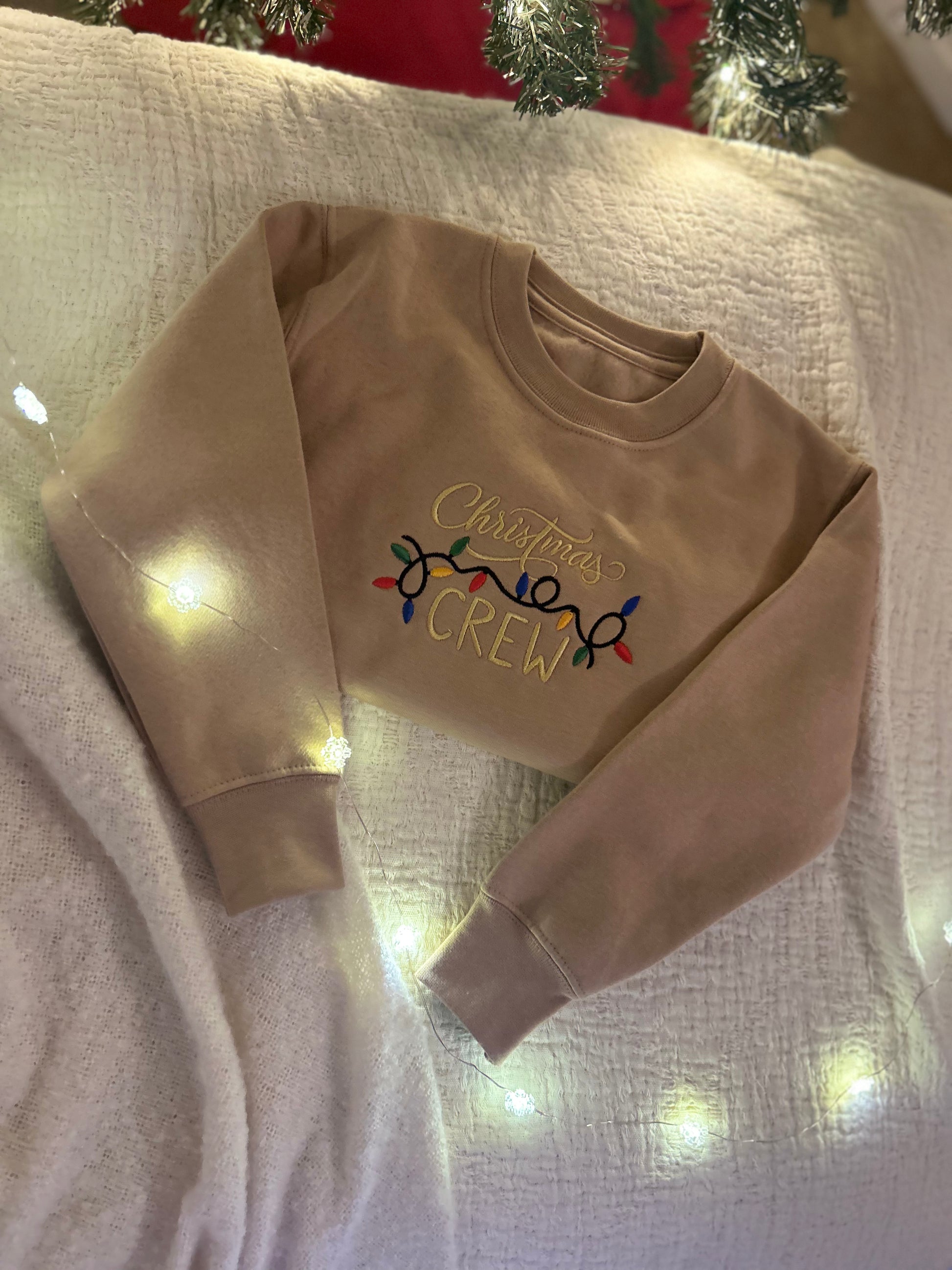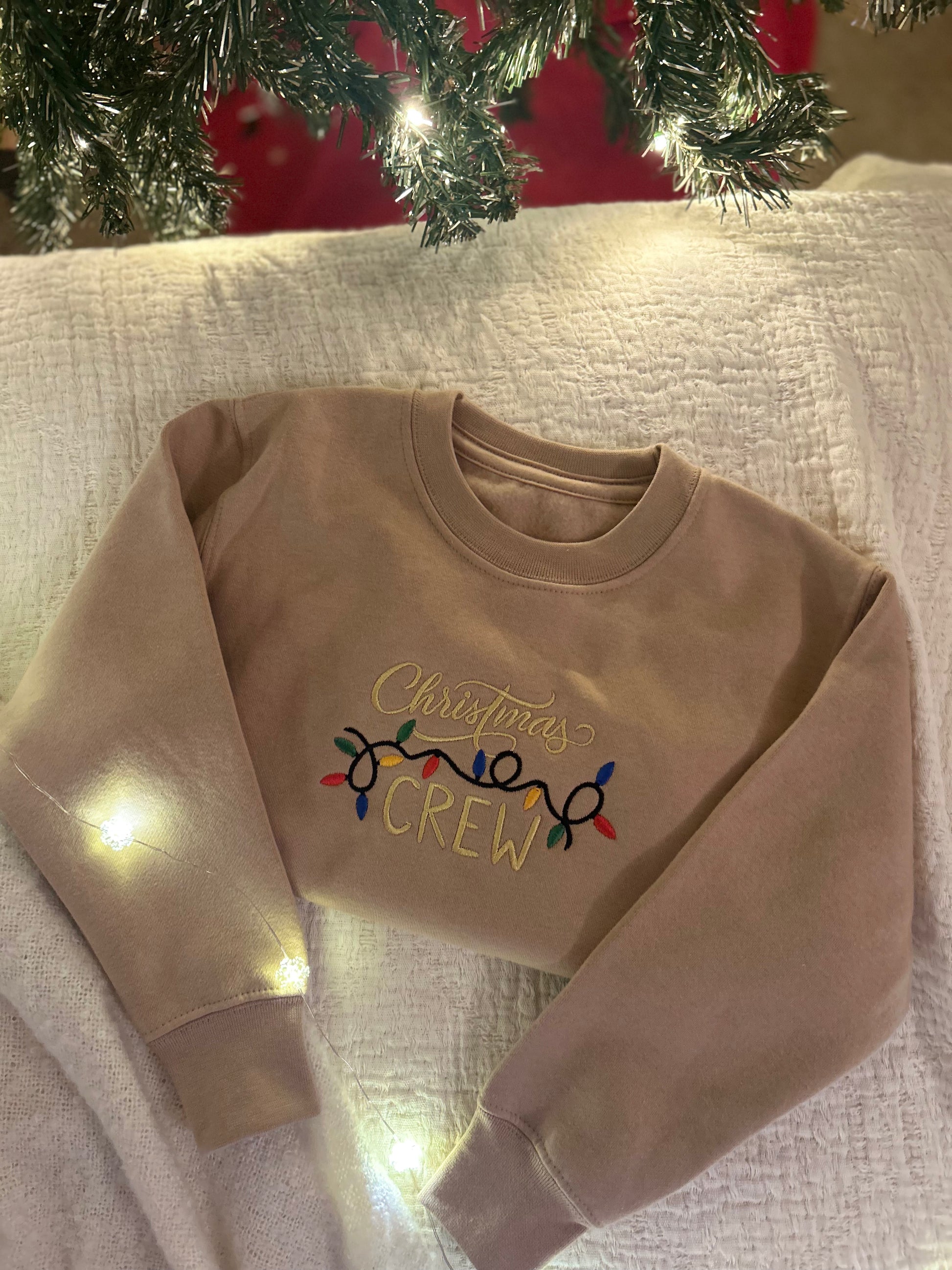 Christmas Crew glows in golden thread beneath a string of embroidered lights - made for matching moments and festive family photos.