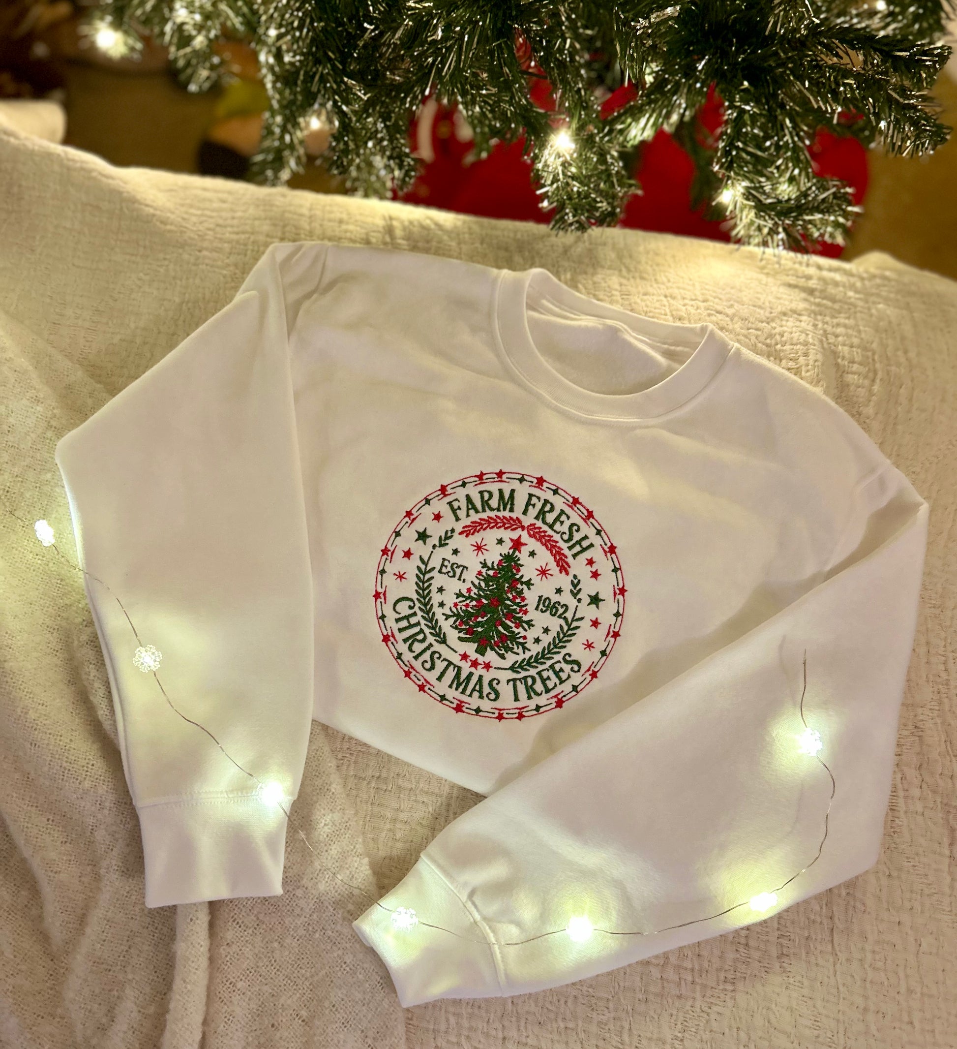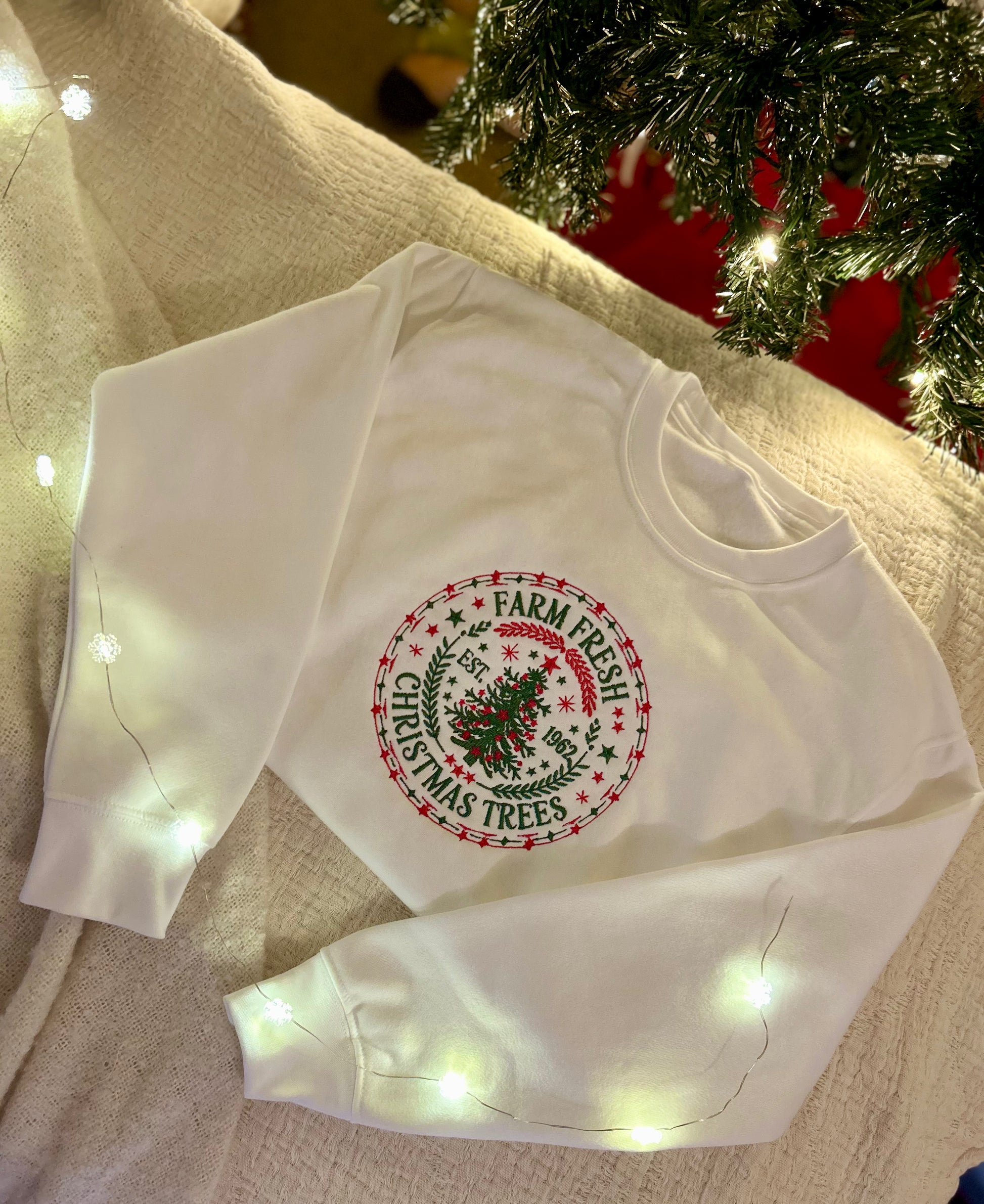 Our Farm Fresh Christmas Trees embroidery pairs classic red and green tones with fine stitched detail - simple, nostalgic, and unmistakably festive.