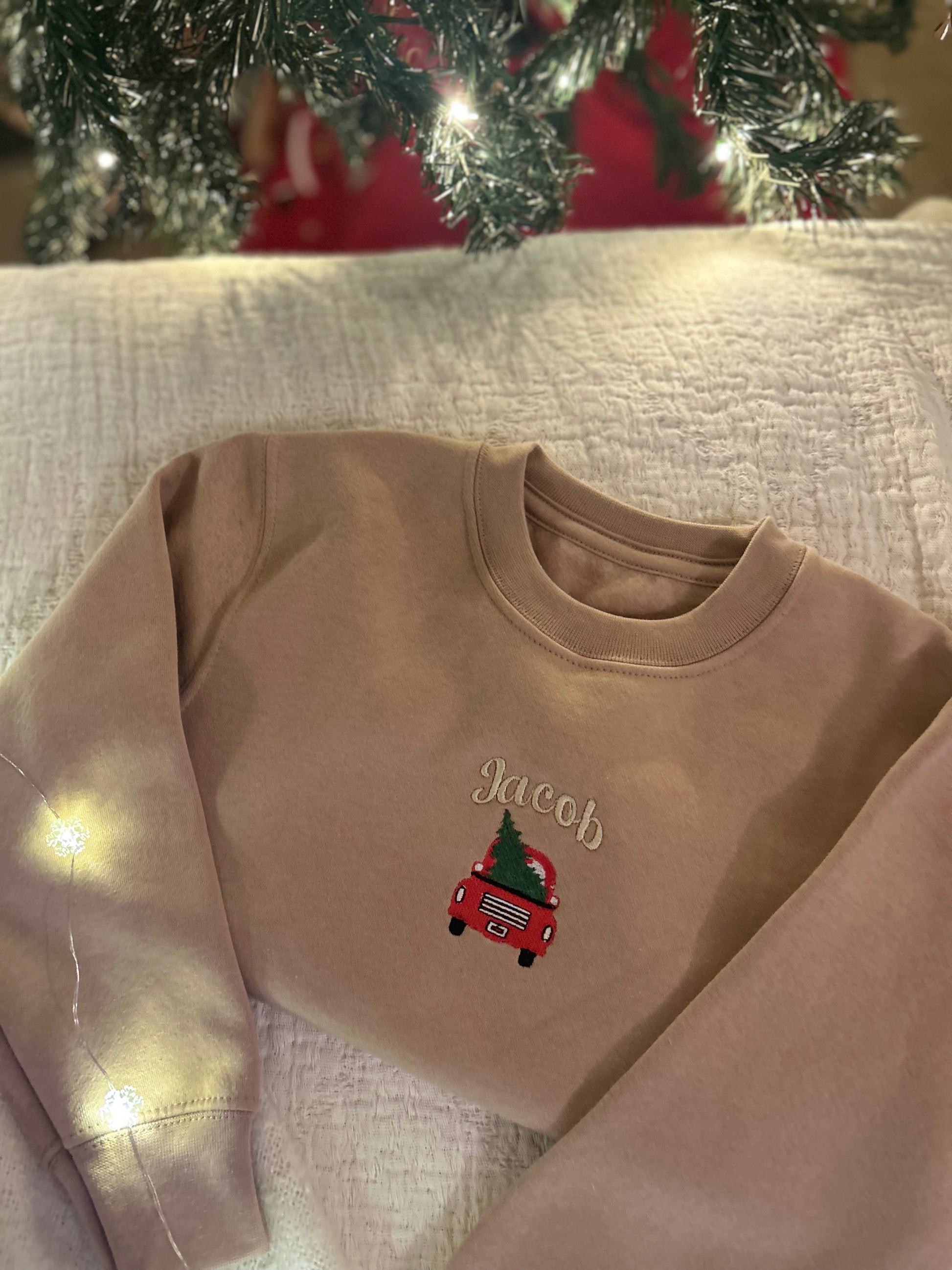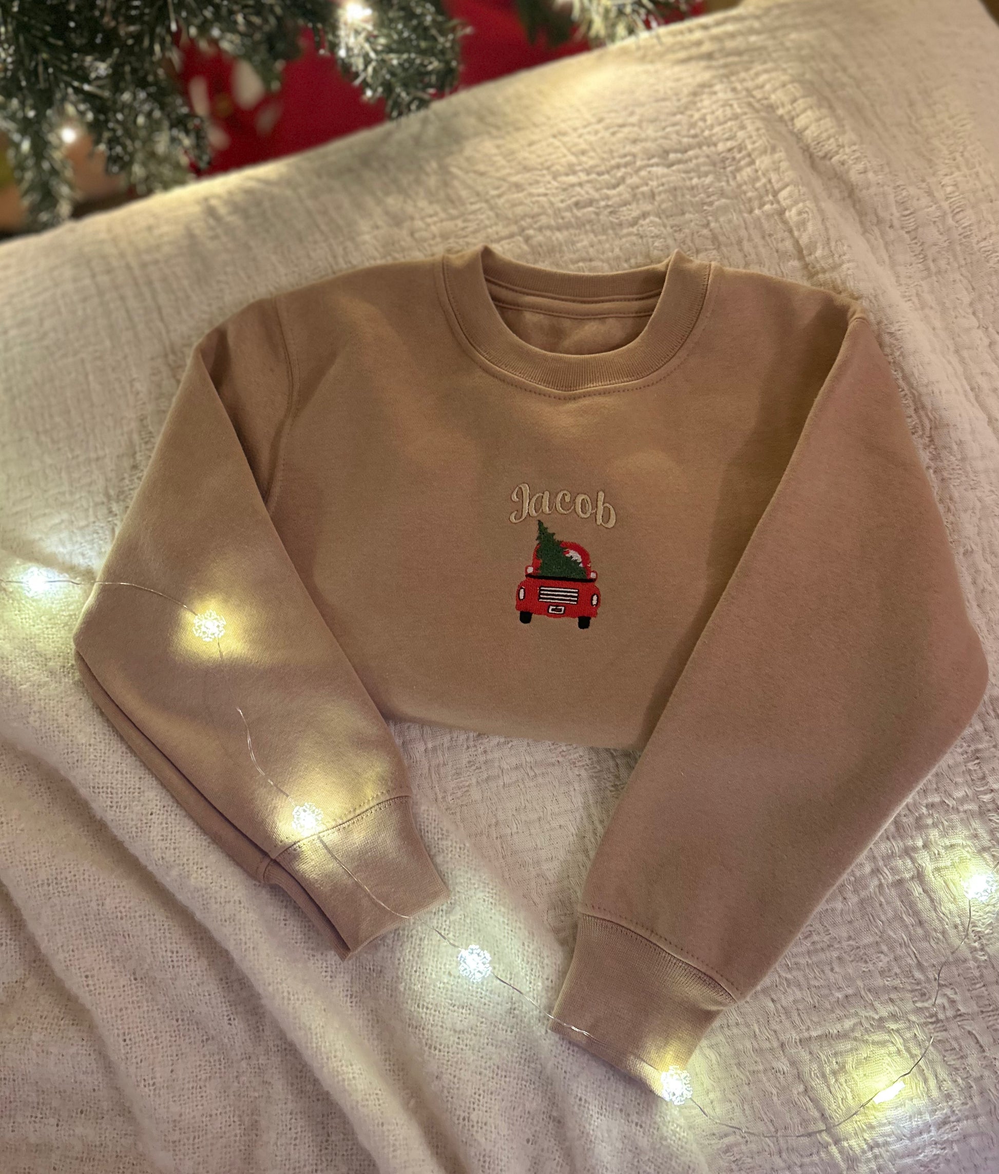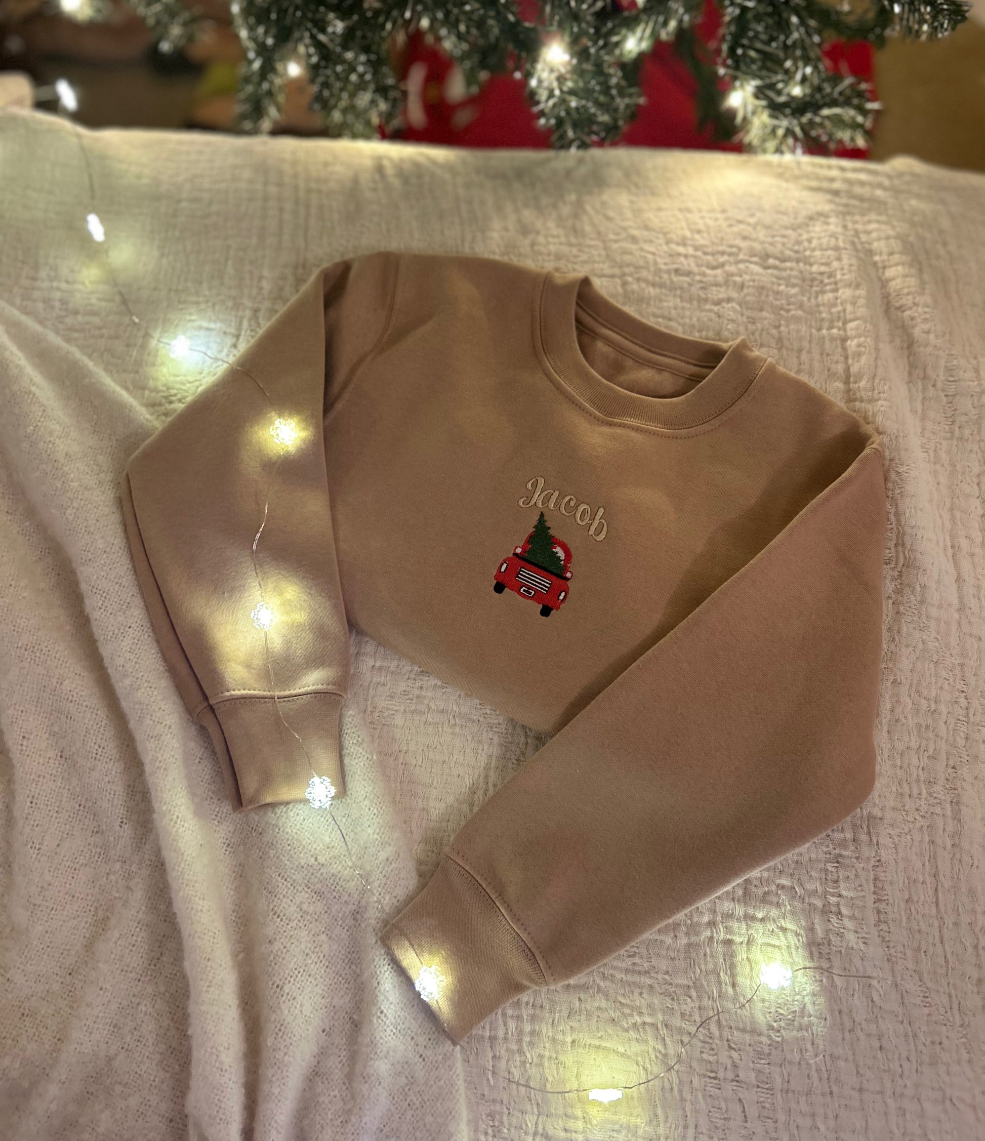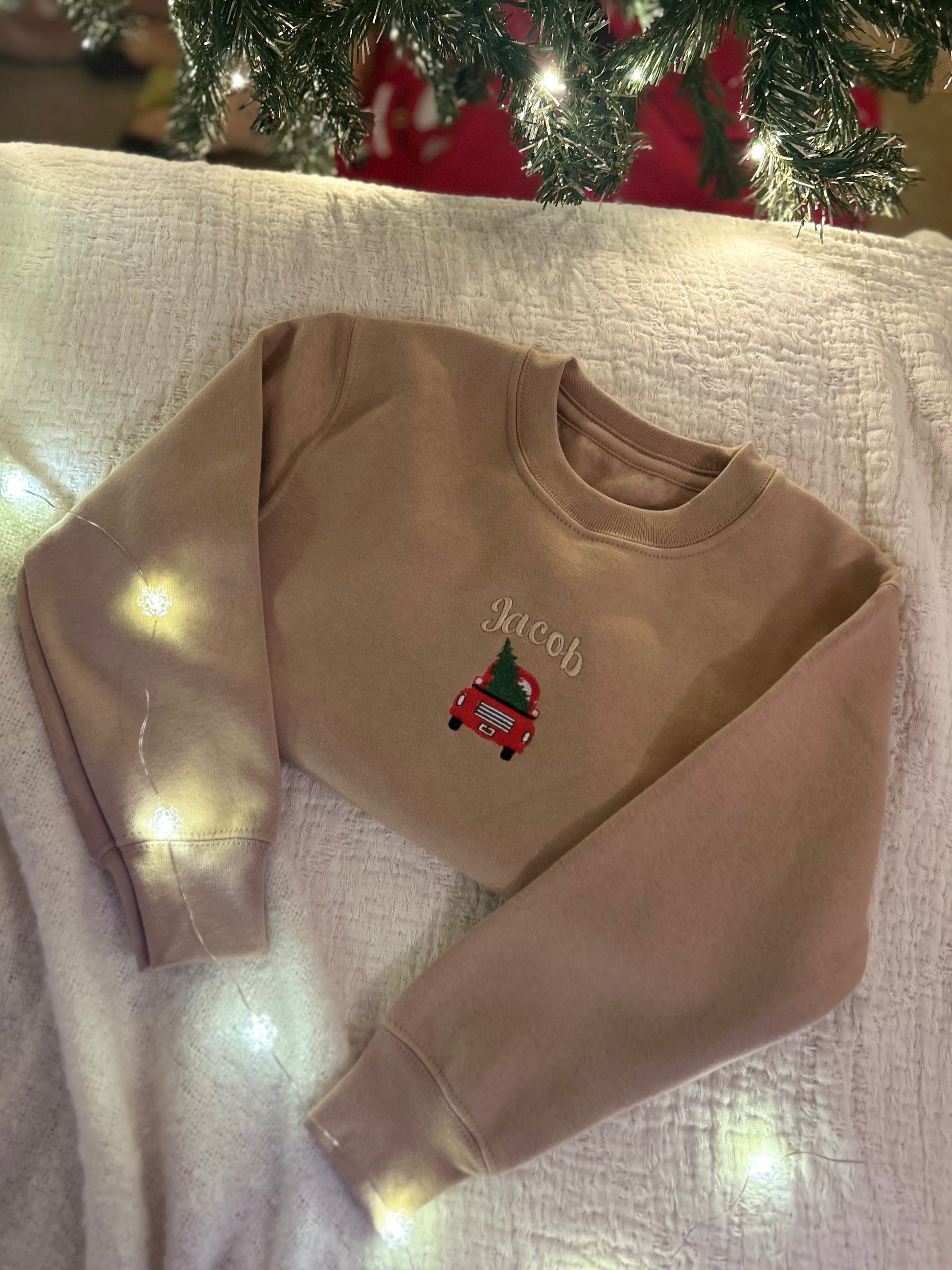A tiny red car carries the tree home, with your child’s name embroidered above — a classic festive scene reimagined in Tiny Thistle’s soft neutral tones.