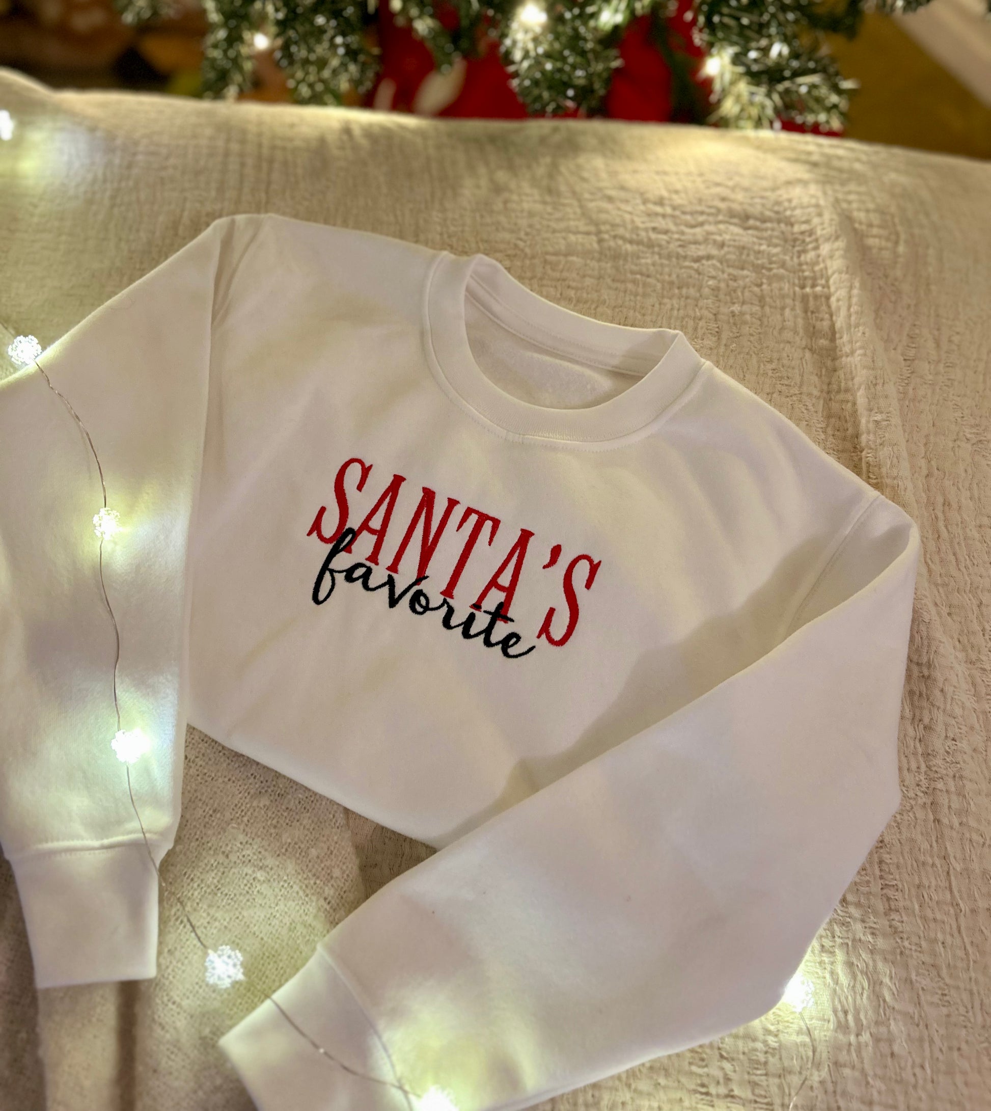 SANTA’S Favourite blends bold red typography with playful script for a confident festive look that’s perfect for photo days and cosy nights.