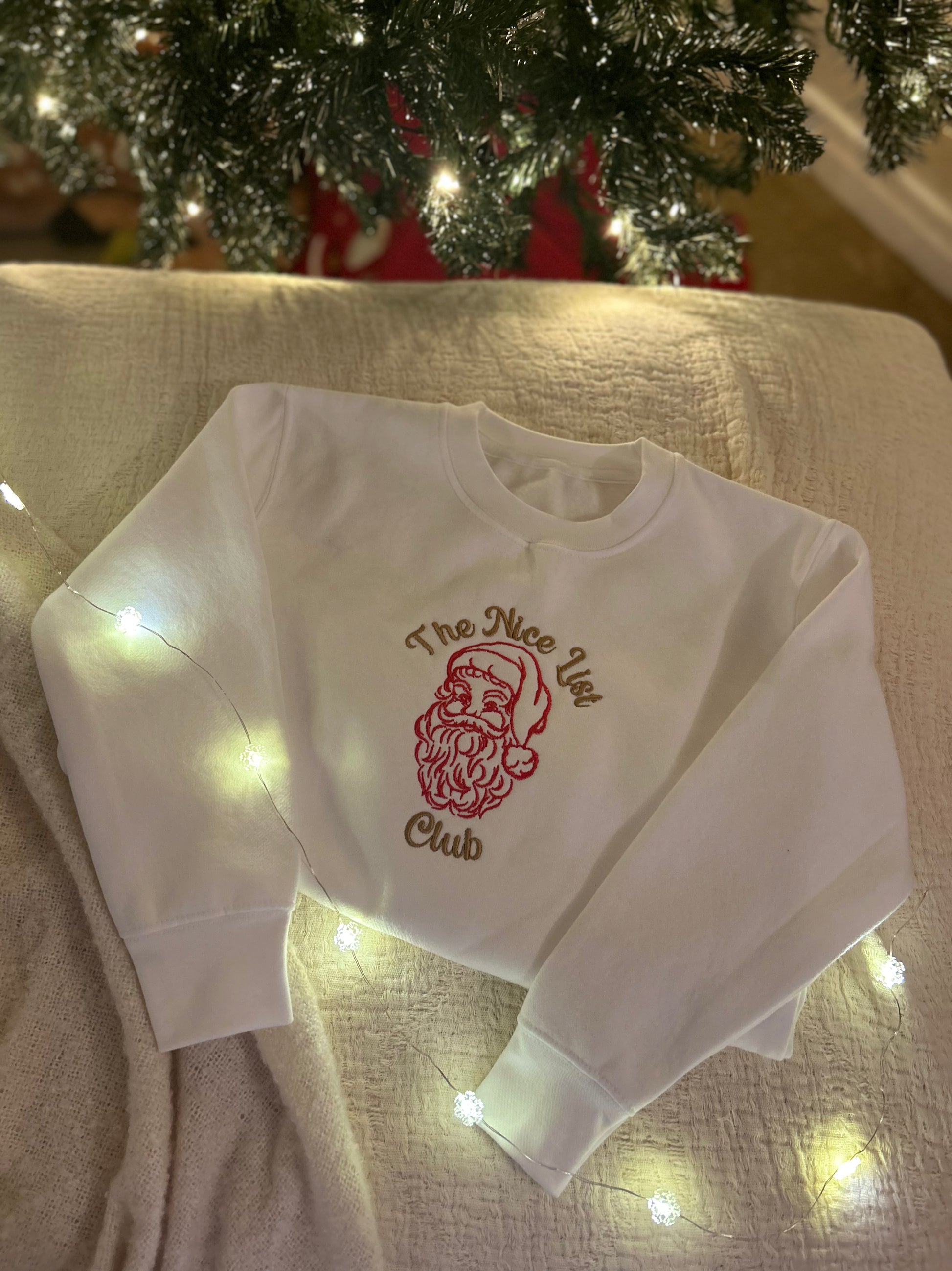 Our vintage Santa motif is paired with golden script reading The Nice List Club - a reminder that magic is still real for those who believe.