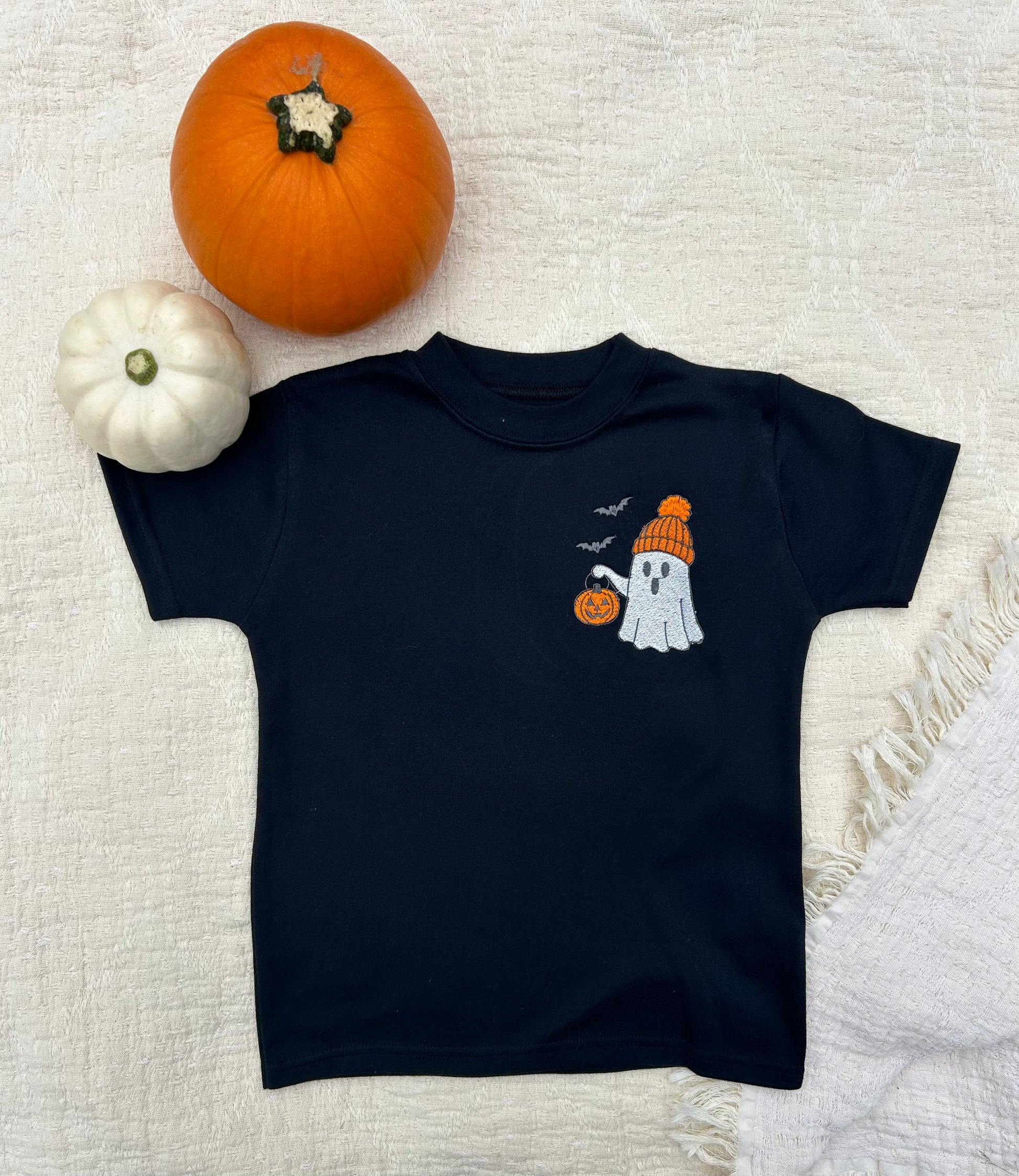 Our embroidered Trick-or-Treat Ghost tee brings Halloween fun to life with its cosy beanie, pumpkin bucket, and a flutter of bats. Perfect for little ones who want to join the spooky fun without a full costume, it’s comfy, stylish, and ideal for every autumn adventure.