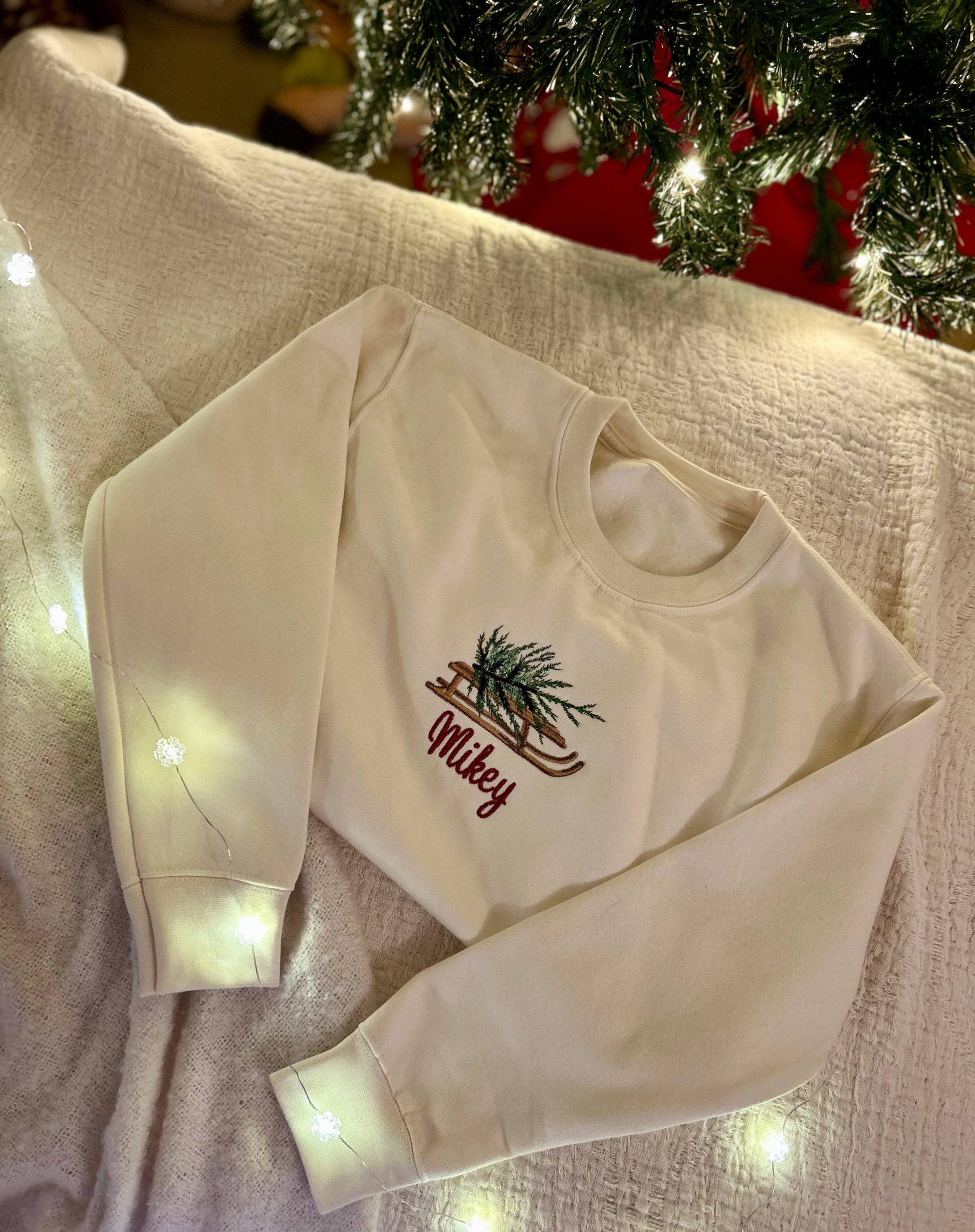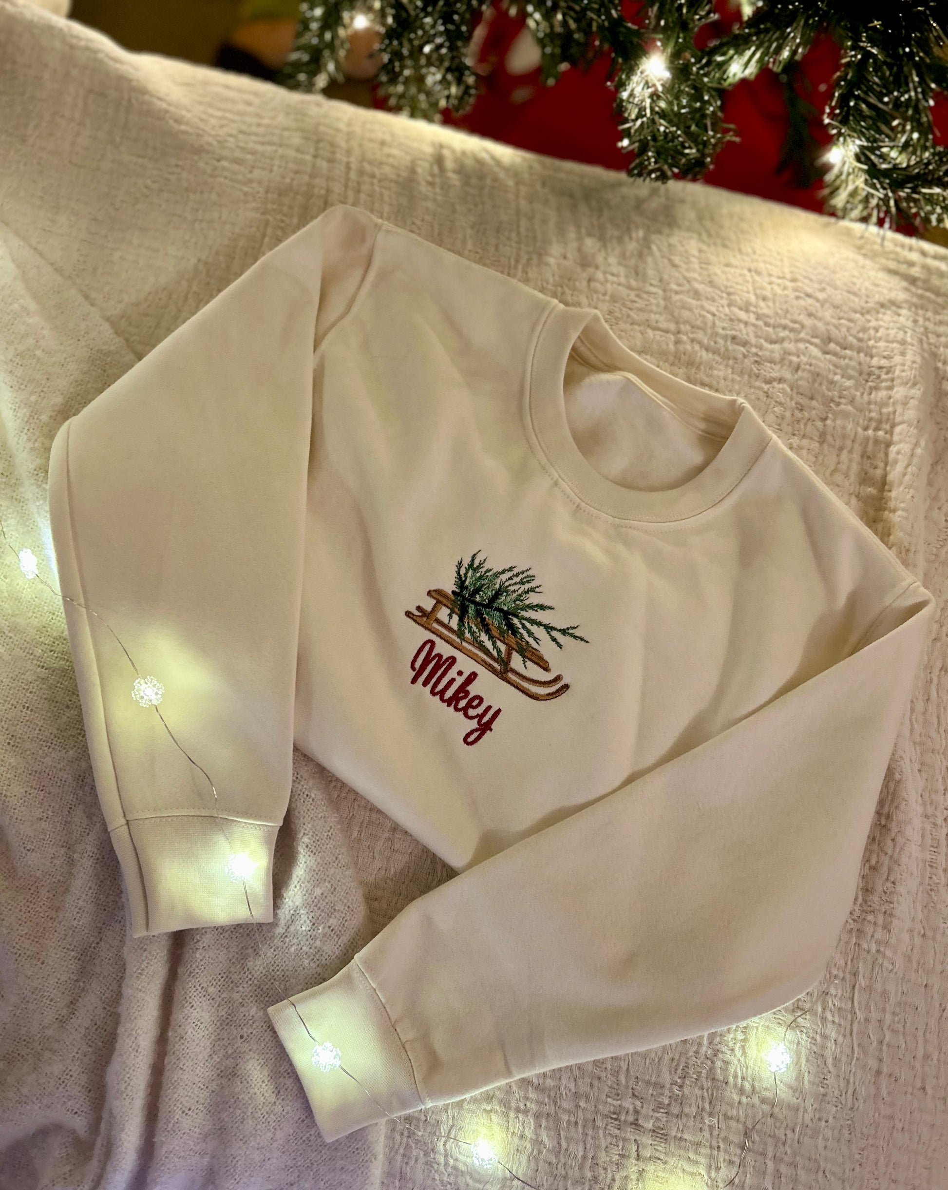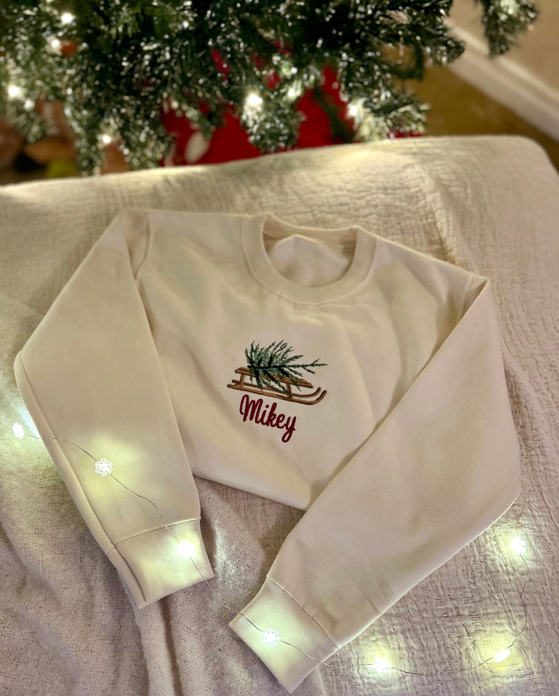 Our vintage sled carries the Christmas tree home, with your child’s name stitched below. Subtle, nostalgic tones make this an instant keepsake.