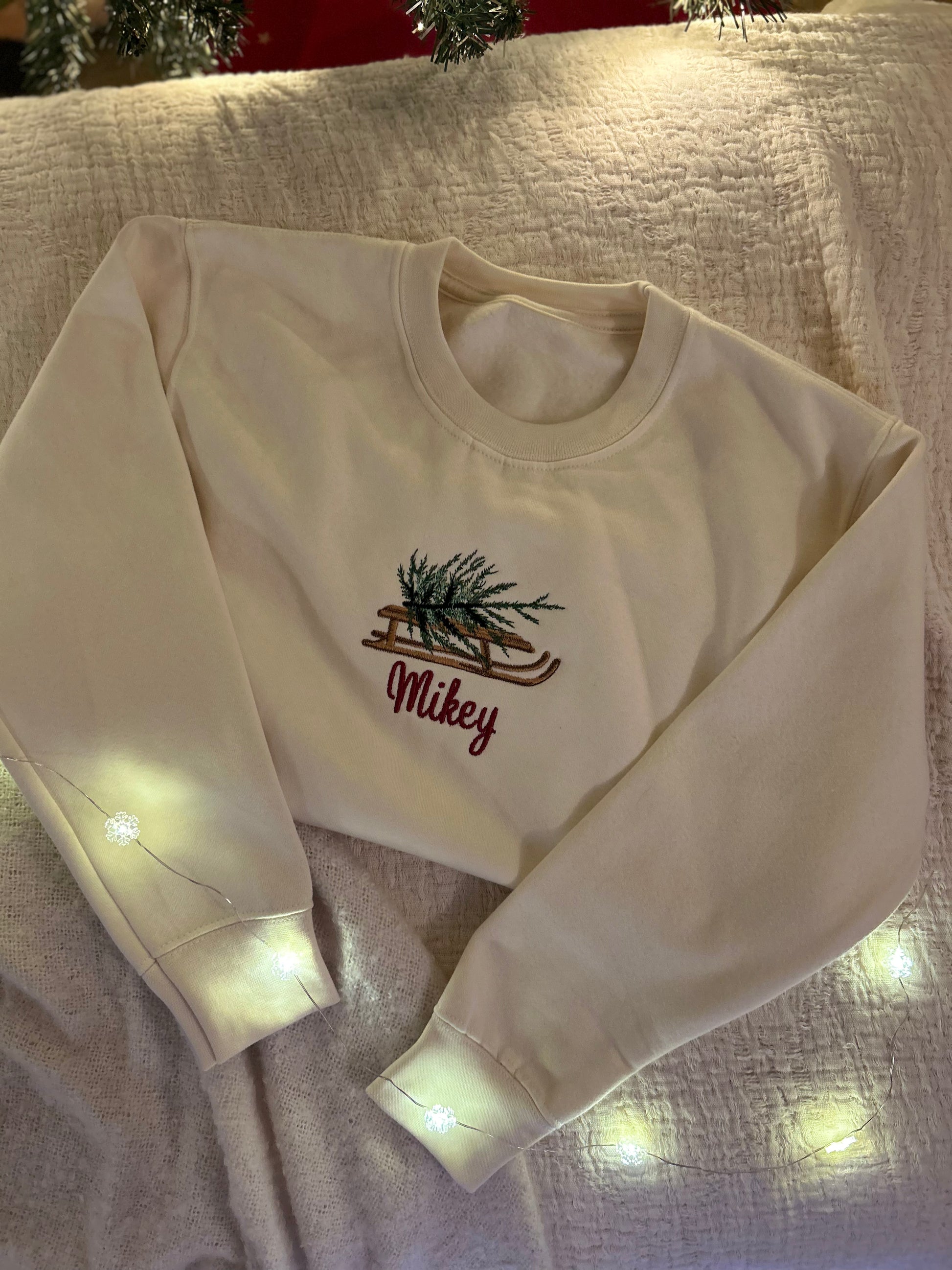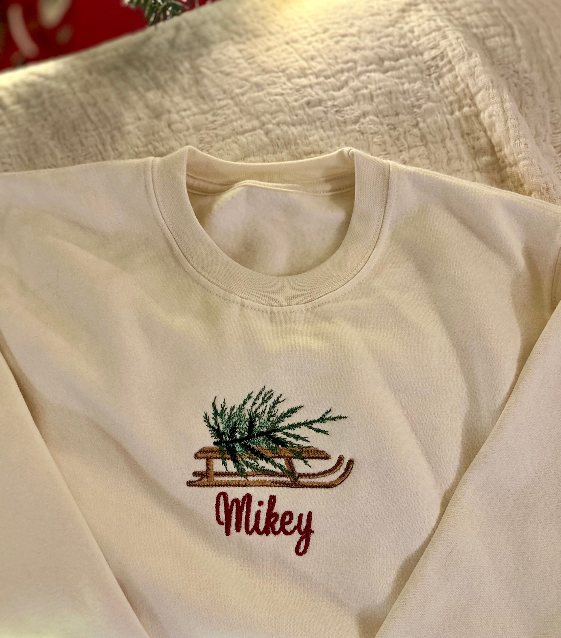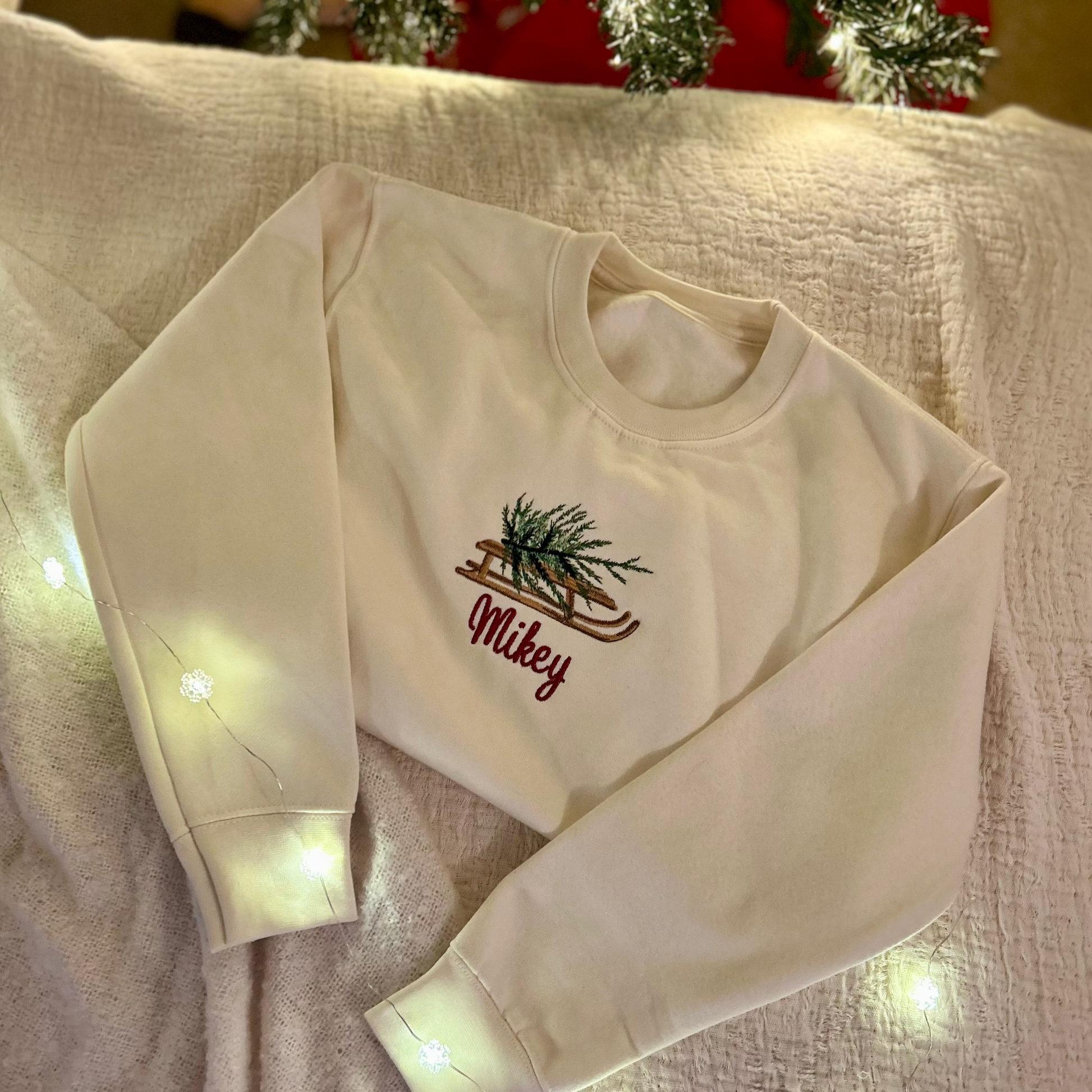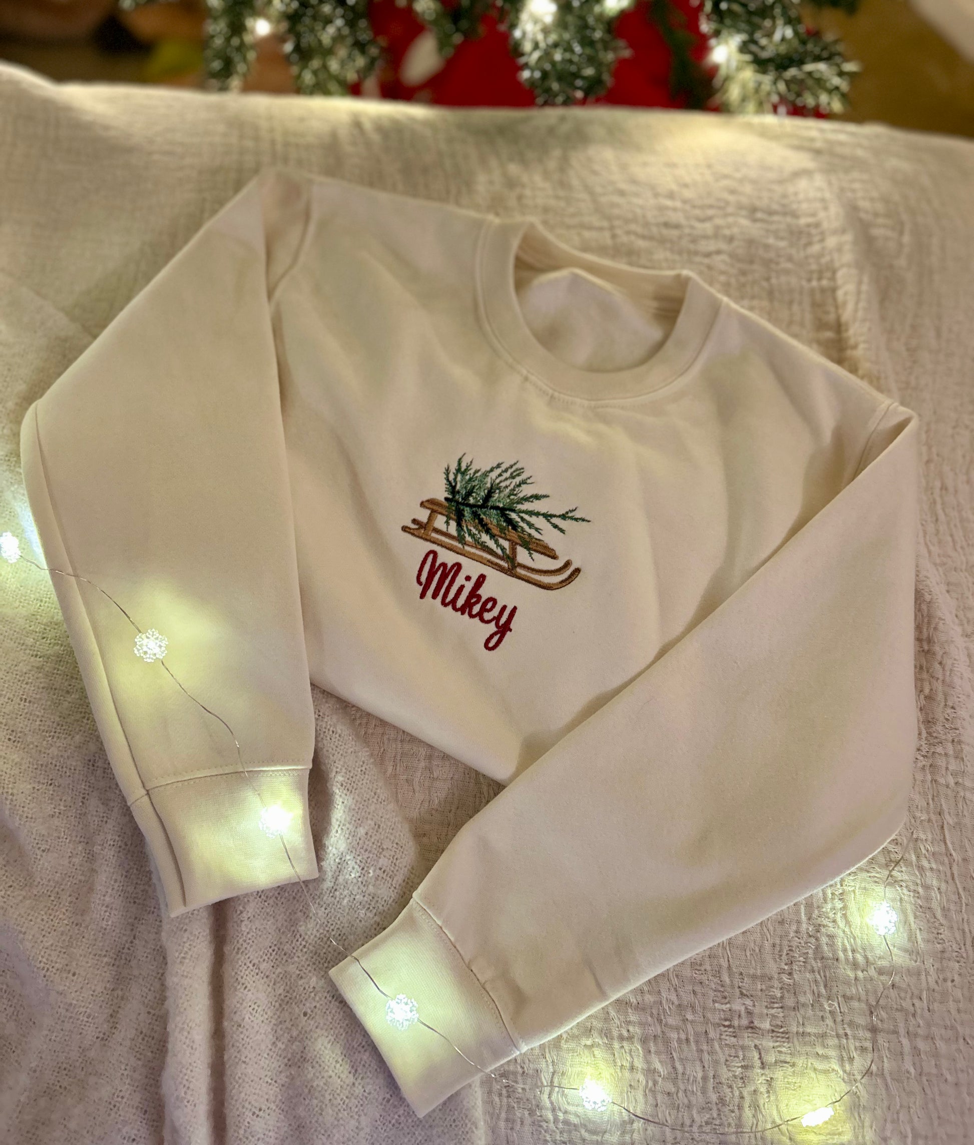 Our vintage sled carries the Christmas tree home, with your child’s name stitched below. Subtle, nostalgic tones make this an instant keepsake.